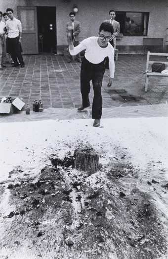 Shimamoto Shozo making a painting by hurling glass bottles of paint against a canvas, 2nd Gutai Art Exhibition (1956, printed 2012)